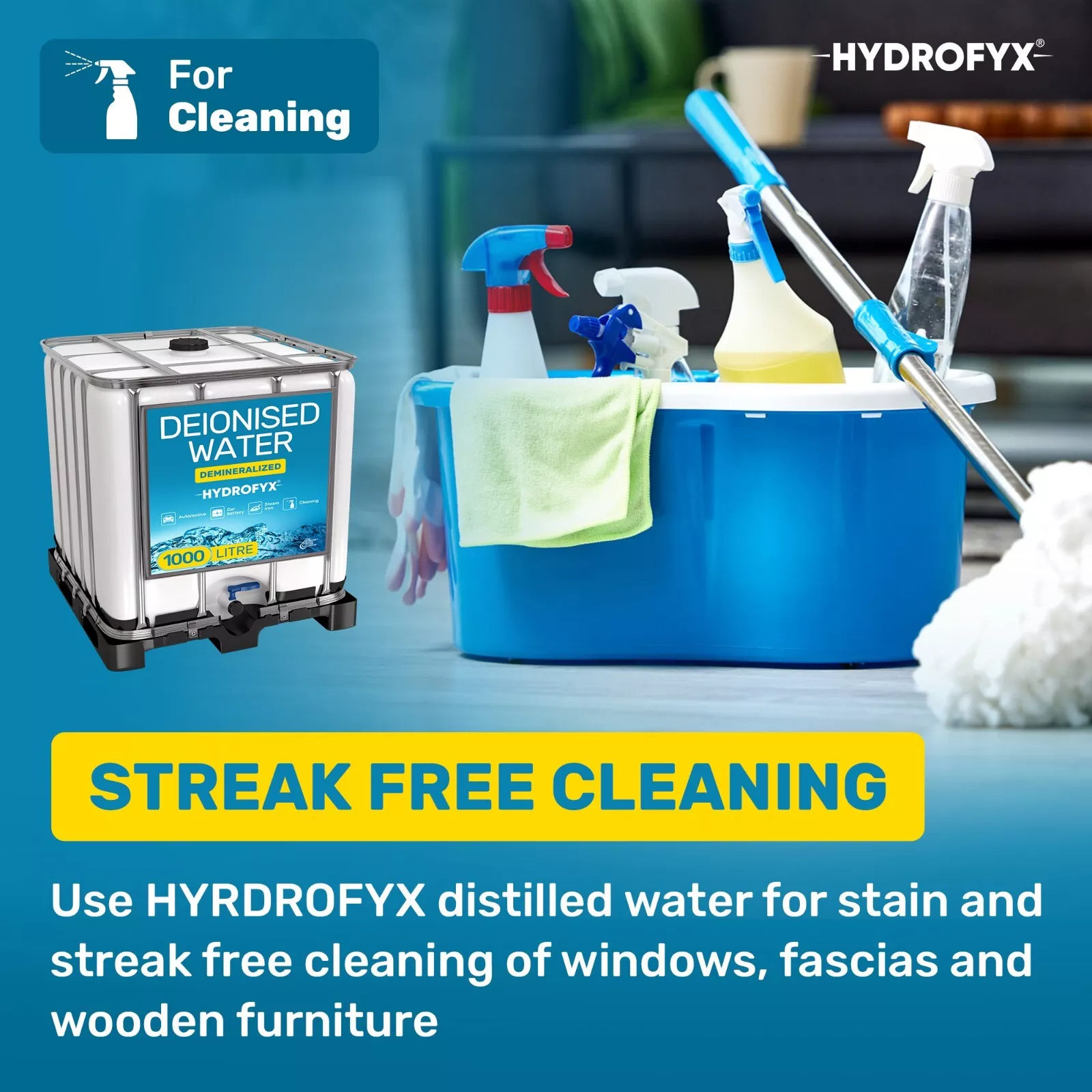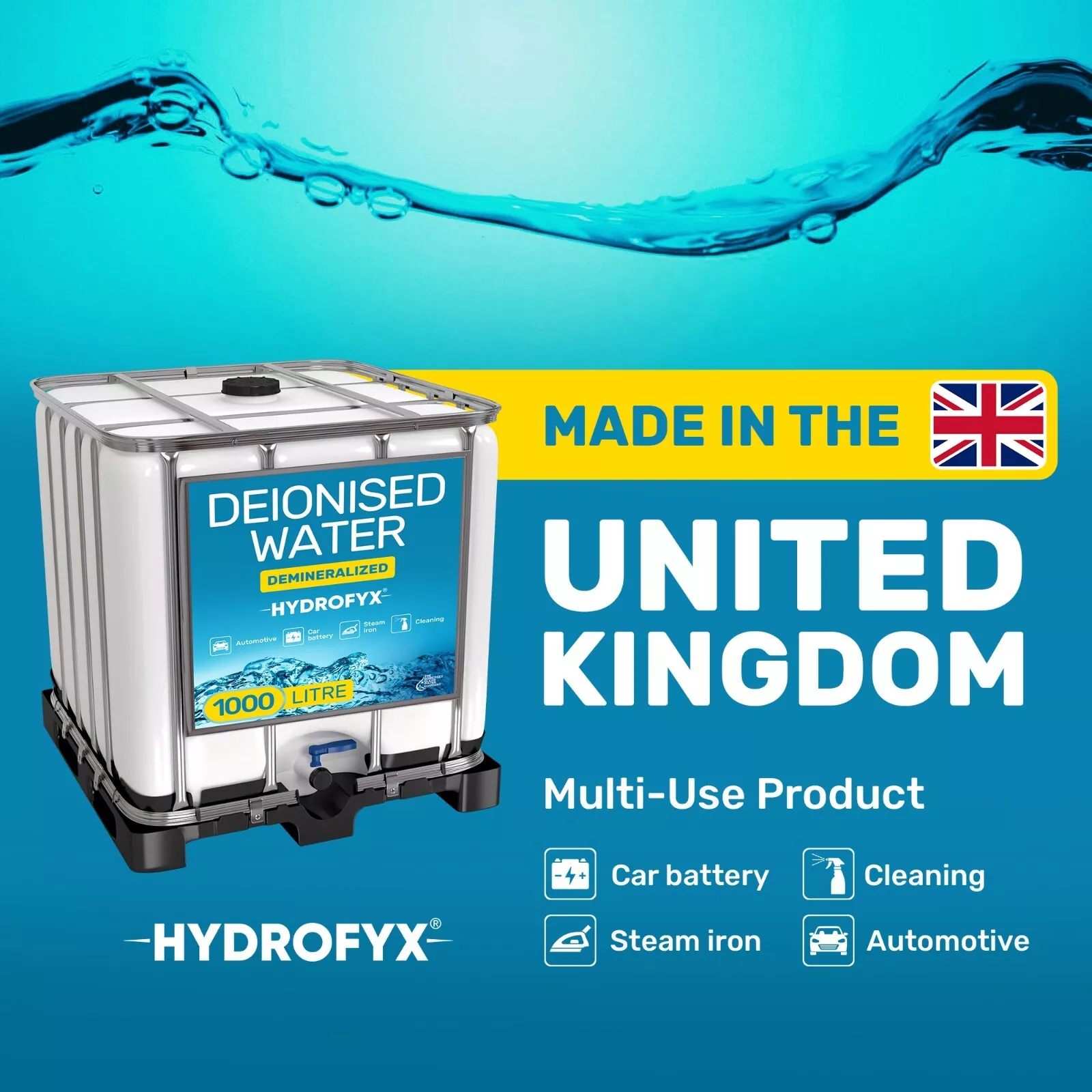 HYDROFYX 1000L Deionised Water (IBC) – Demineralised & Non-Distilled – For Irons, Steam Cleaners, Car Batteries, Radiators & Humidifiers